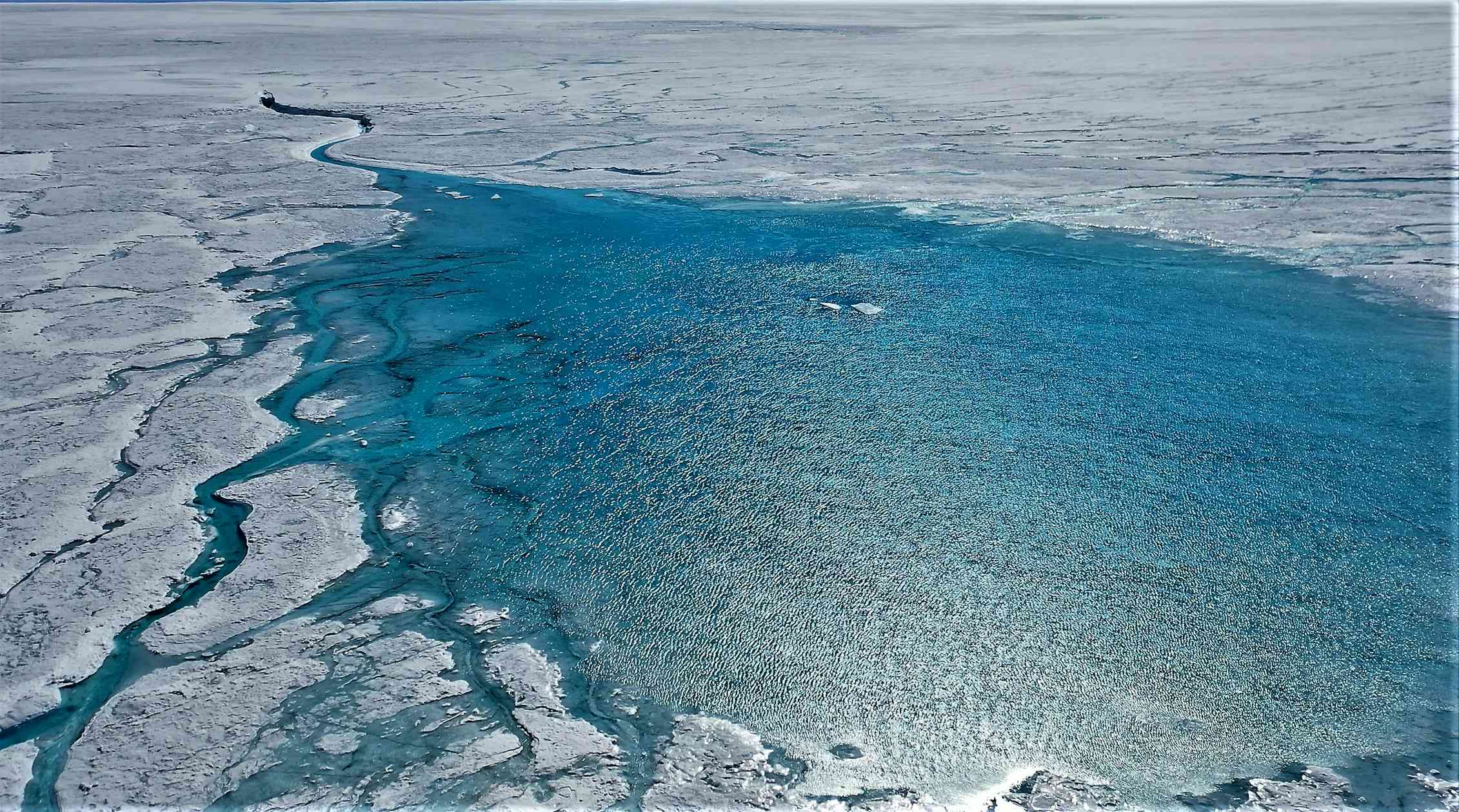 – Supraglacial lakes and river networks are draining into fractures and moulins, bringing with them vast quantities of latent heat. This “cryo-hydraulic warming” within and at the base of the ice sheet softens and thaws the bed, thereby accelerating interior ice flow down to the margins.